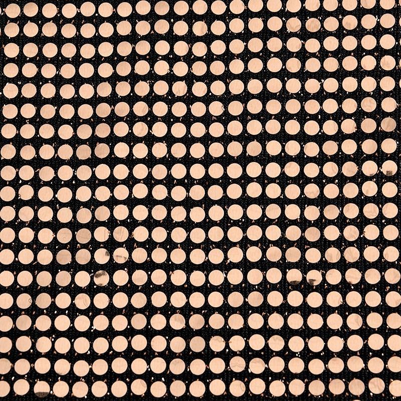 Трикотажное черное полотно с блестящими зеркальными золотистыми круглыми пайетками. Декор накатан на основу, поэтому будет комфортен в носке. Ткань пластичная, прекрасно драпируется и укладывается в складки, легко садится по фигуре за счёт основы с эластаном, не прозрачная, позволит шить изделия без подклада. Идеально подойдет для пошива нарядных вечерних образов: платья, юбки, топа, туники, широких брюк, жакета, кардигана.