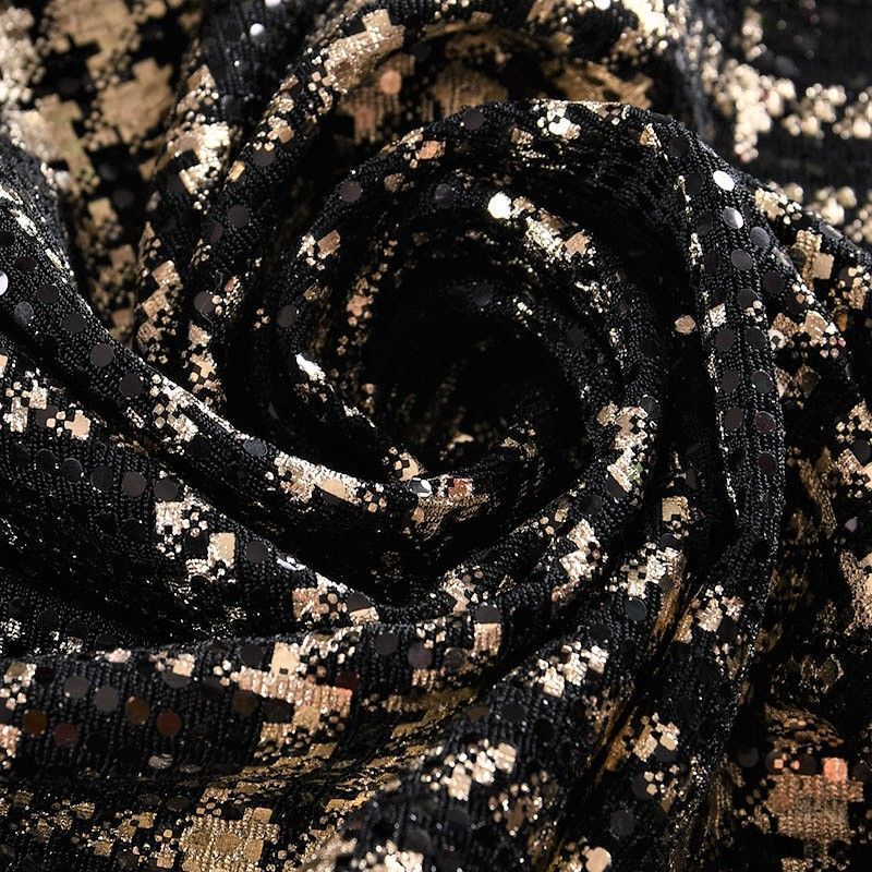 Трикотажное черное полотно золотистым геометрическим узором и деликатными прозрачными круглыми пайетками. Декор накатан на основу, поэтому будет комфортен в носке. Ткань пластичная, прекрасно драпируется и укладывается в складки, легко садится по фигуре за счёт основы с эластаном, не прозрачная, позволит шить изделия без подклада. Идеально подойдет для пошива нарядных вечерних образов: платья, юбки, топа, туники, широких брюк, жакета, кардигана.