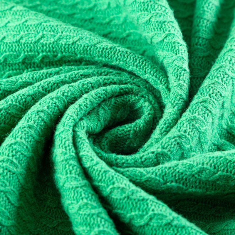 Итальянский шерстяной трикотаж зеленого оттенка с ажурными вязаными "косами". Полотно плотное, мягкое, эластичное, не просвечивает. Прекрасно подойдет для пошива теплых и уютных свитеров, кардиганов, жилета, платьев, шарфов, палантинов, пончо или снудов.