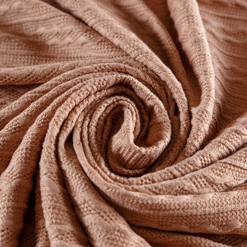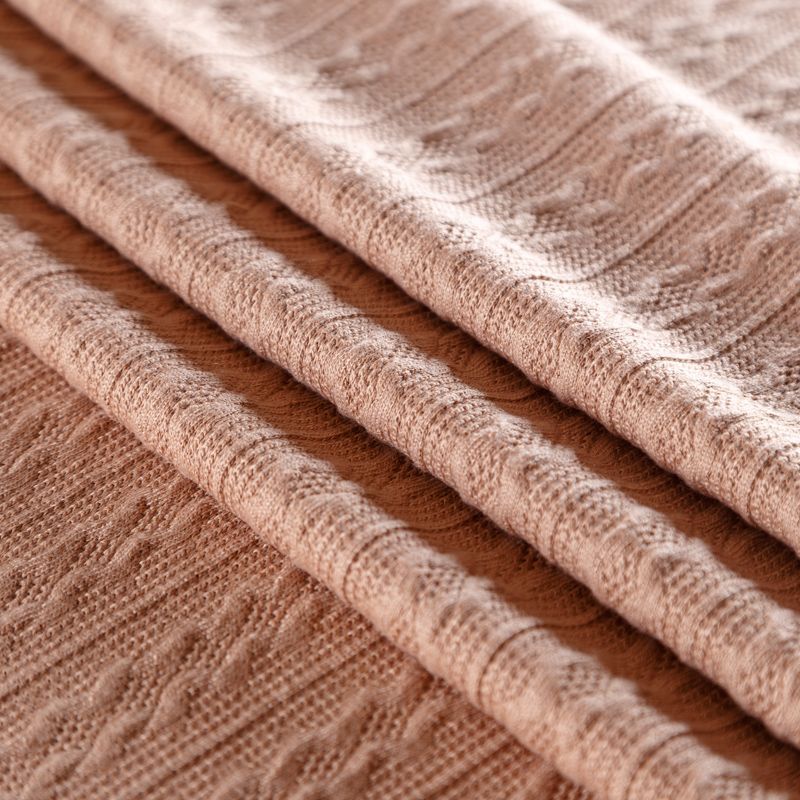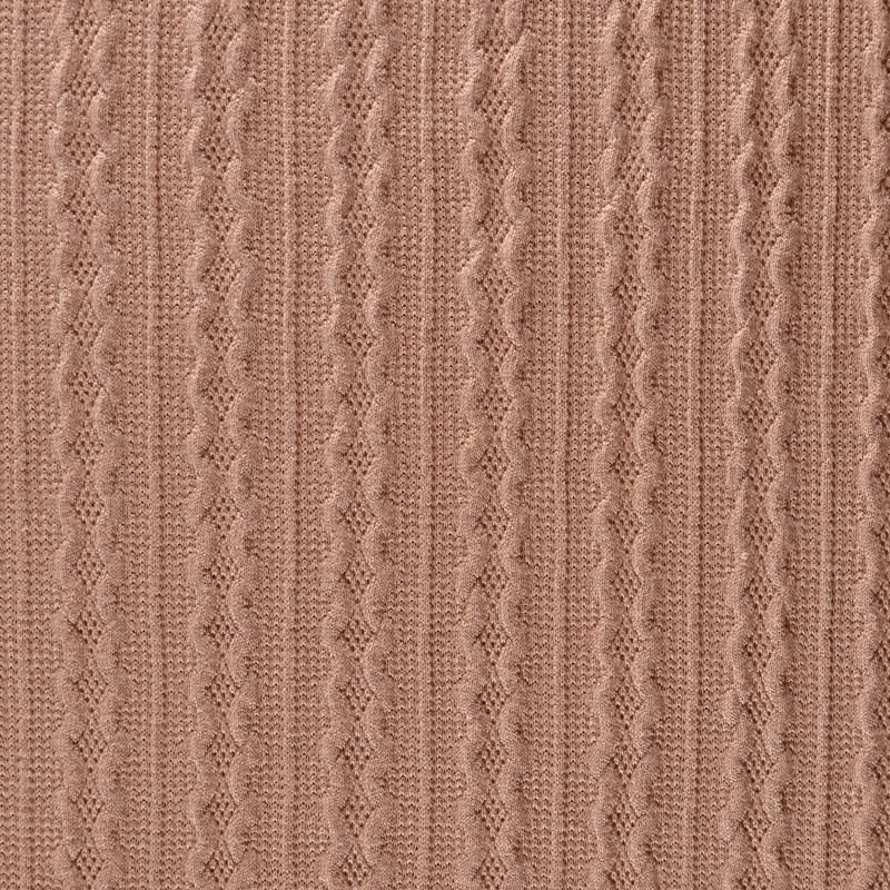 Текстурное вязаное, мягкое, пластичное полотно средней плотности в бежевом оттенке. Вязаный узор - стилизованая косичка с полосками расположен по всему полотну. Подойдет для пошива уютного свитера, кардигана, юбки, платья, водолазок, снудов и головных уборов.