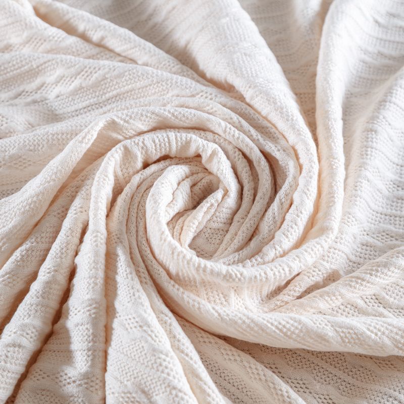 Текстурное вязаное, мягкое, пластичное полотно средней плотности в молочном оттенке. Вязаный узор - стилизованая косичка с полосками расположен по всему полотну. Подойдет для пошива уютного свитера, кардигана, юбки, платья, водолазок, снудов и головных уборов.