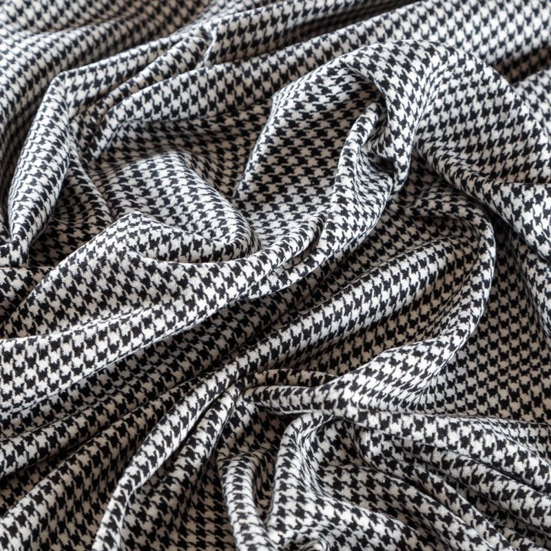 Твид белого цвета с плетеной матовой поверхностью, мелкий узор "гусиная лапка" образуется переплетением черных нитей. Ткань не сухая, мягкая, но плотная, не просвечивает, теплая, хоршо драпируется. Отлично подойдет для пошива легкой верхней одежды, жакетов, костюмов, юбок.
