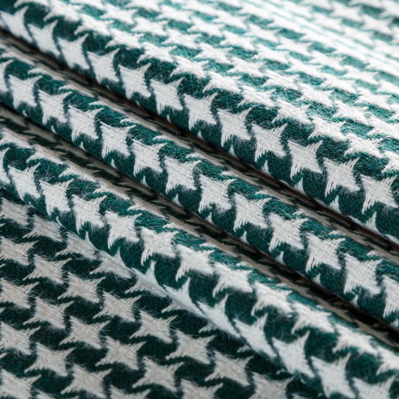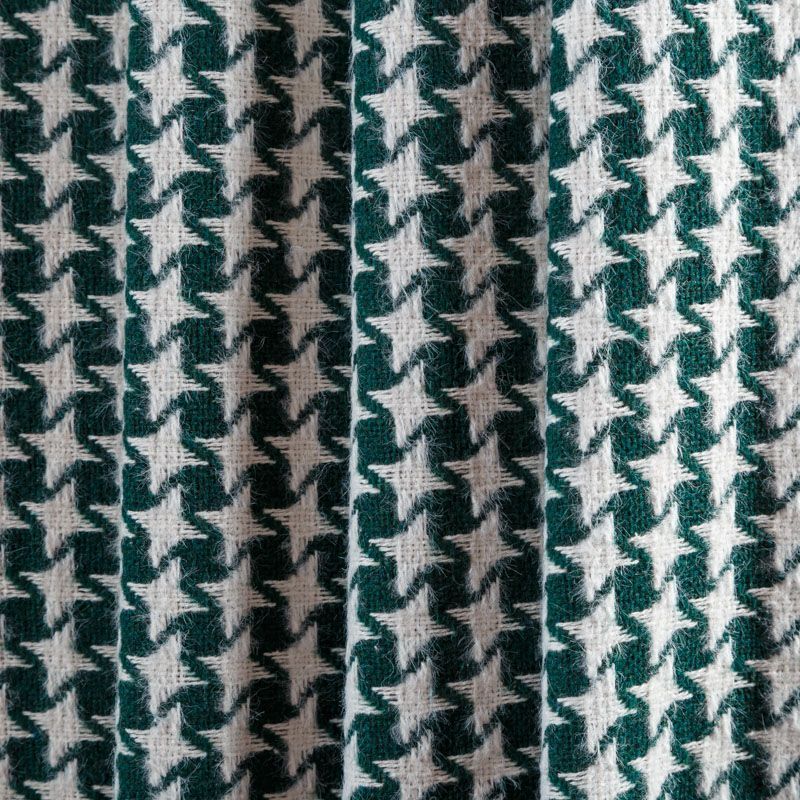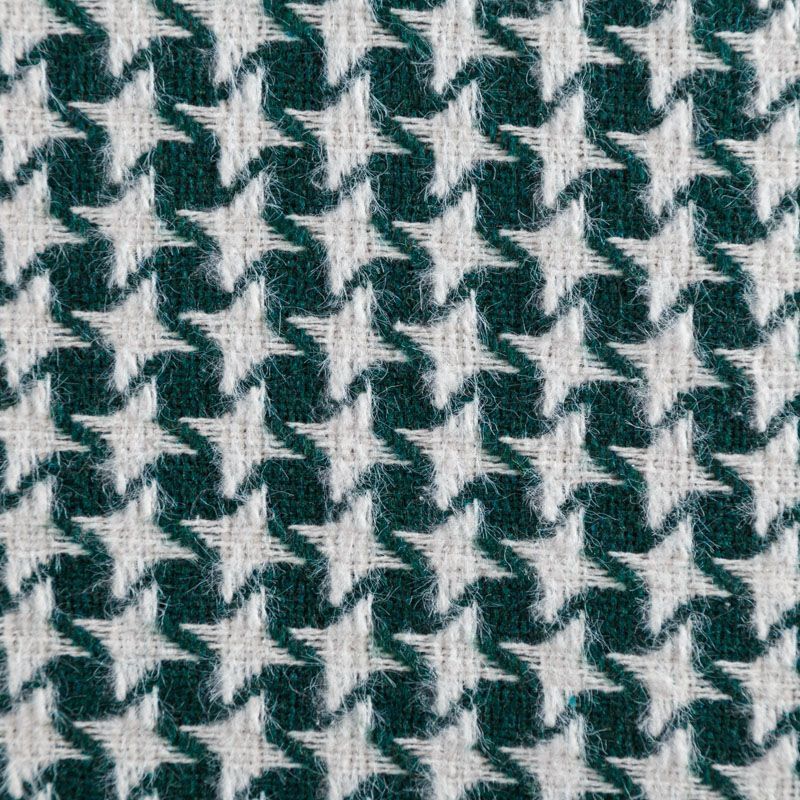 Костюмный твид с темно-зеленого оттенка с геометрическим узором молочного цвета. Ткань плотная, мягкая, приятная на ощупь, прочная, не вытирается. Отличный выбор для осенних костюмов, облегченного пальто, куртки, бомбера, юбки, шорт или теплого платья.