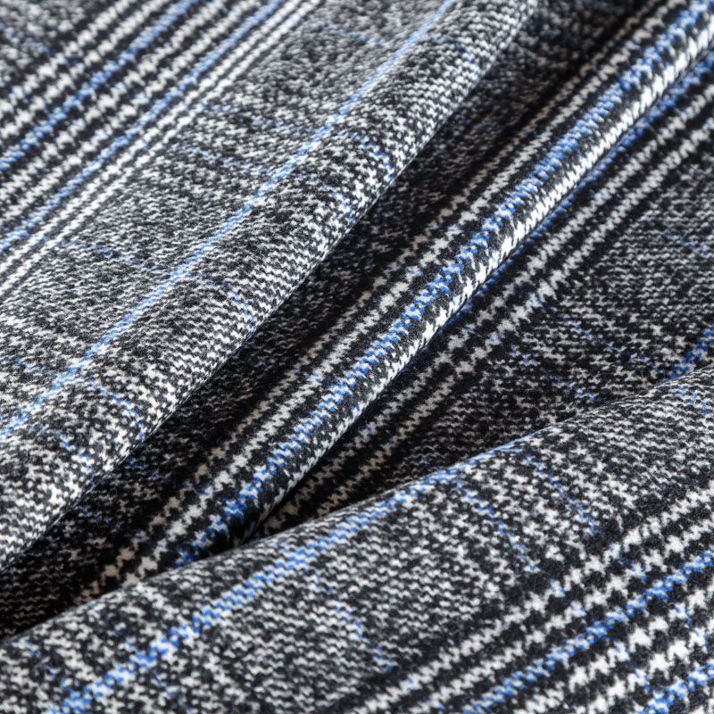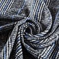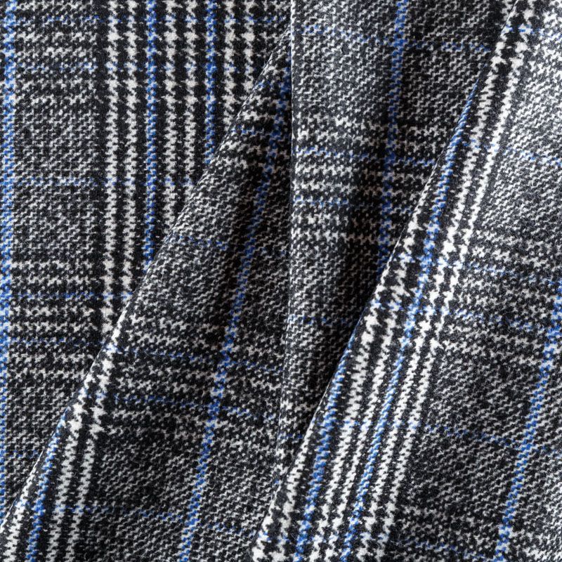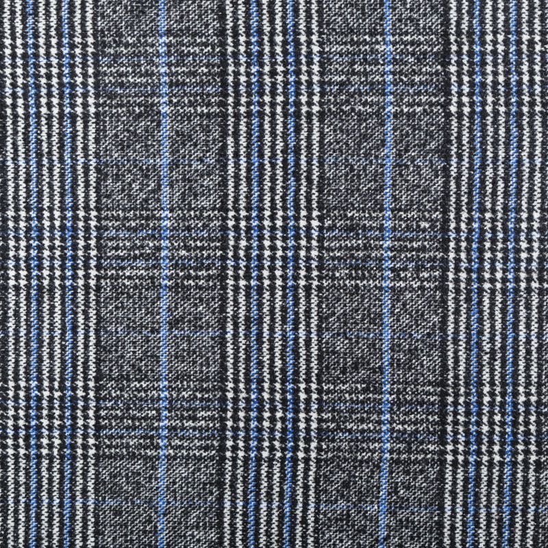Фактурная твидовая ткань с добавлением хлопка. Сочетание линий белого, черного и голубого цвета образуют красивую клетку тартан. Ткань мягкая, пластичная, приятная на ощупь. Хорошо драпируется и образует формоустойчивые складки. Твид отлично подходит для пошива костюмов, пальто, пиджаков, брюк и курток, юбок, жилетов, головных уборов в классическом стиле.