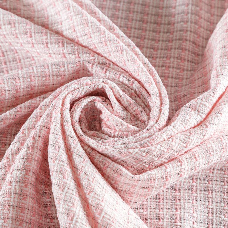 Отличительная особенность этой ткани в полотняном плетении нитей, характерного для рогожки, олицетворяющая сложную "клетчатую" геометрию в розово-молочных оттенках. Различная толщина нитей создает эффектную фактуру. Ткань достаточно формоустойчивая, при этом пластичная, гибкая за счет плетения,  матовая, мягкая, приятная на ощупь, не рыхлая. Прекрасно подойдет для пошива жакета, юбки в виде трапеции, легкого пальто, костюма.