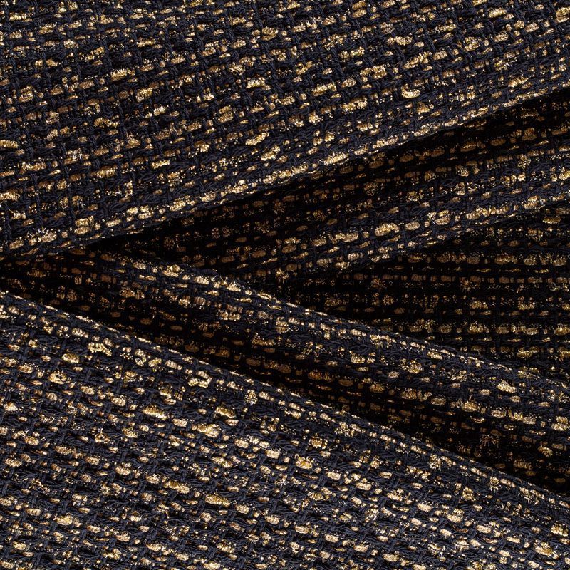 Твид черного цвета с золотыми нитями и лентами, которые, переплетаясь, образуют красивую фактуру с узелками различной толщины. Ткань украшена золотистой люрексной нитью, которая придает ей блеск и гламур. В меру рыхлая, плотная, будет уместна в изделиях "на каждый день" и "на выход".