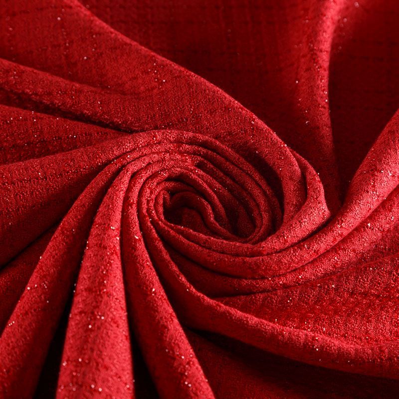 Твид средней плотности с рельефной поверхностью красного оттенка с добавлением акцента в виде люрексовой нити, которая имитирует клетку и добавляет ткани нарядности. Твид пластичный, хорошо драпируется, умеренно держит форму, прекрасно подойдет для пошива жакетов на подкладе, жилетов, кардиганов, легких пальто, юбок и платьев.