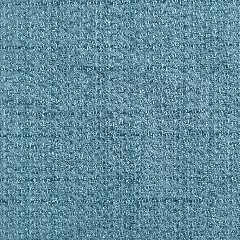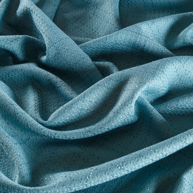 Твид средней плотности с рельефной поверхностью бирюзового оттенка с добавлением акцента в виде люрексовой нити, которая имитирует клетку и добавляет ткани нарядности. Твид пластичный, хорошо драпируется, умеренно держит форму, прекрасно подойдет для пошива жакетов на подкладе, жилетов, кардиганов, легких пальто, юбок и платьев.
