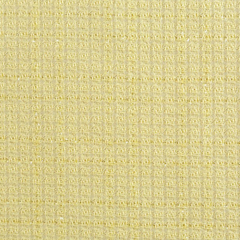 Твид средней плотности с рельефной поверхностью светло-желтого оттенка с добавлением акцента в виде люрексовой нити, которая имитирует клетку и добавляет ткани нарядности. Твид пластичный, хорошо драпируется, умеренно держит форму, прекрасно подойдет для пошива жакетов на подкладе, жилетов, кардиганов, легких пальто, юбок и платьев.