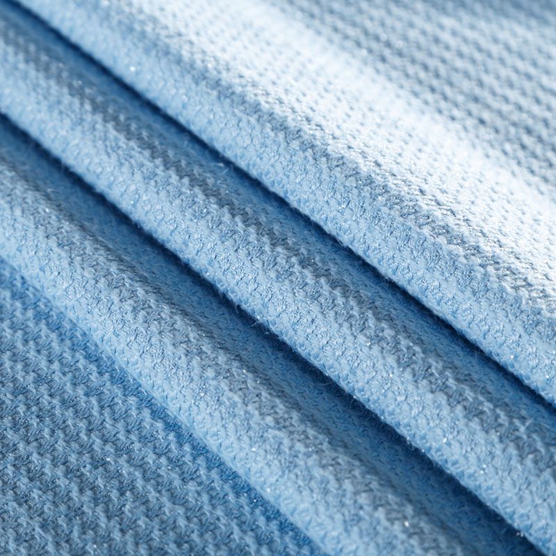 Твид средней плотности с рельефной поверхностью голубого оттенка с добавлением акцента в виде люрексовой нити, которая имитирует клетку и добавляет ткани нарядности. Твид пластичный, хорошо драпируется, умеренно держит форму, прекрасно подойдет для пошива жакетов на подкладе, жилетов, кардиганов, легких пальто, юбок и платьев.
