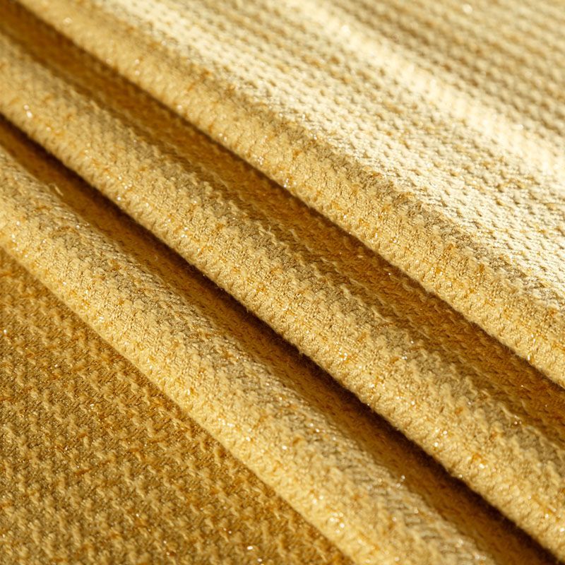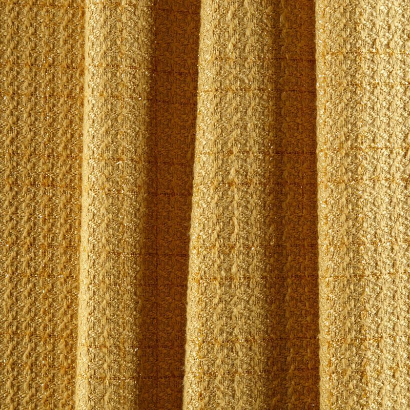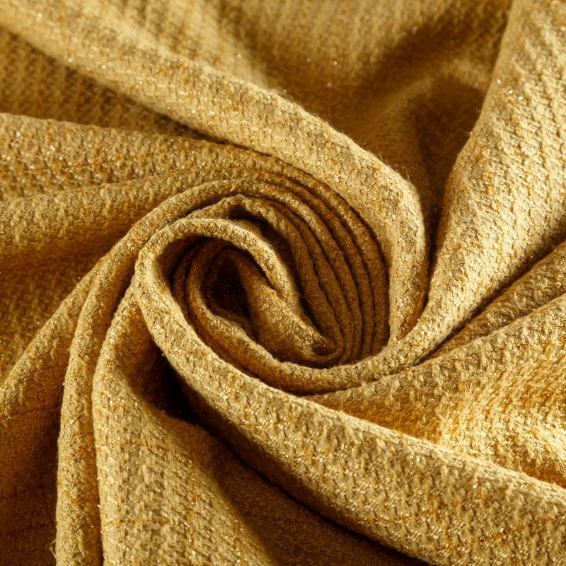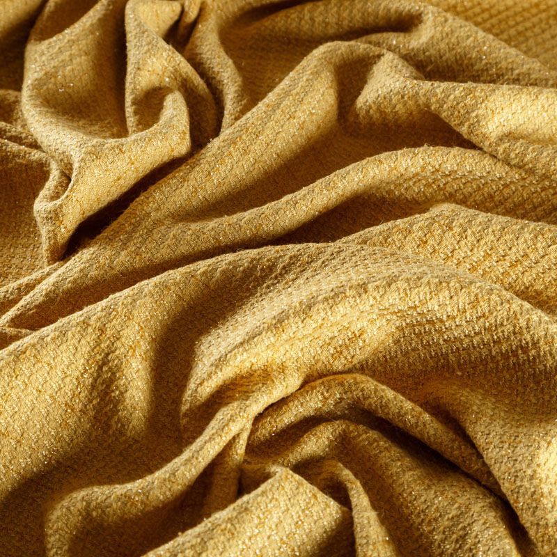 Твид средней плотности с рельефной поверхностью оттенка охры с добавлением акцента в виде люрексовой нити, которая имитирует клетку и добавляет ткани нарядности. Твид пластичный, хорошо драпируется, умеренно держит форму, прекрасно подойдет для пошива жакетов на подкладе, жилетов, кардиганов, легких пальто, юбок и платьев.