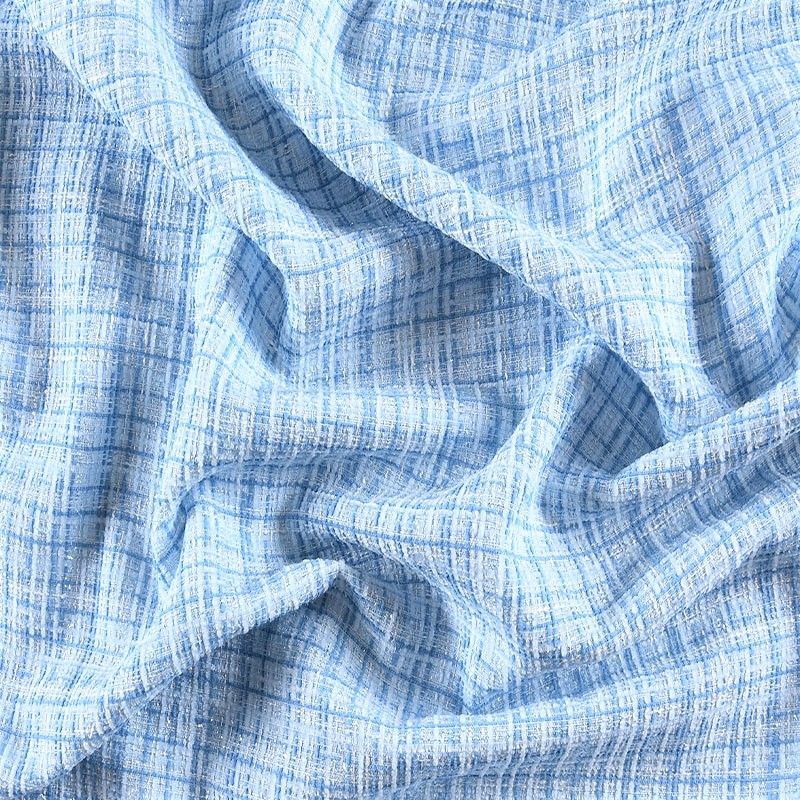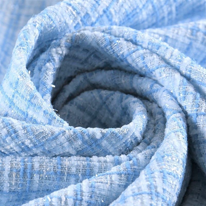 Мягкая, пластичная и объемная ткань, с разреженной и рельефной вывязанной структурой. Буклированный твид в стиле Шанель буквально соткан из различных по толщине и текстуре нитей, образующих рисунок в виде клетки. В плетение добавлена блестящая люрексная нить. Твид идеально подходит для пошива платьев, юбок, жакетов, легких пальто, эффектных бомберов и курток.