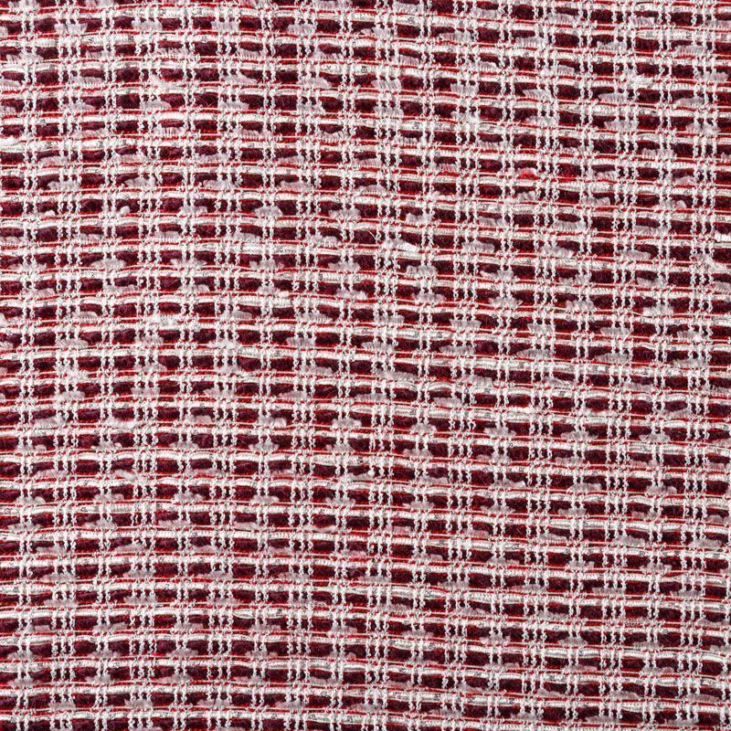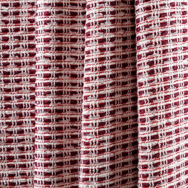 Твид бордового цвета с белыми нитями и лентами, которые, переплетаясь, образуют красивую фактуру с узелками различной толщины. Ткань мягкая, пластичная, хорошо драпируется,  гибкая за счет плетения, приятная на ощупь, не рыхлая.  Подойдет для пошива платья, юбки, костюма, жакета.