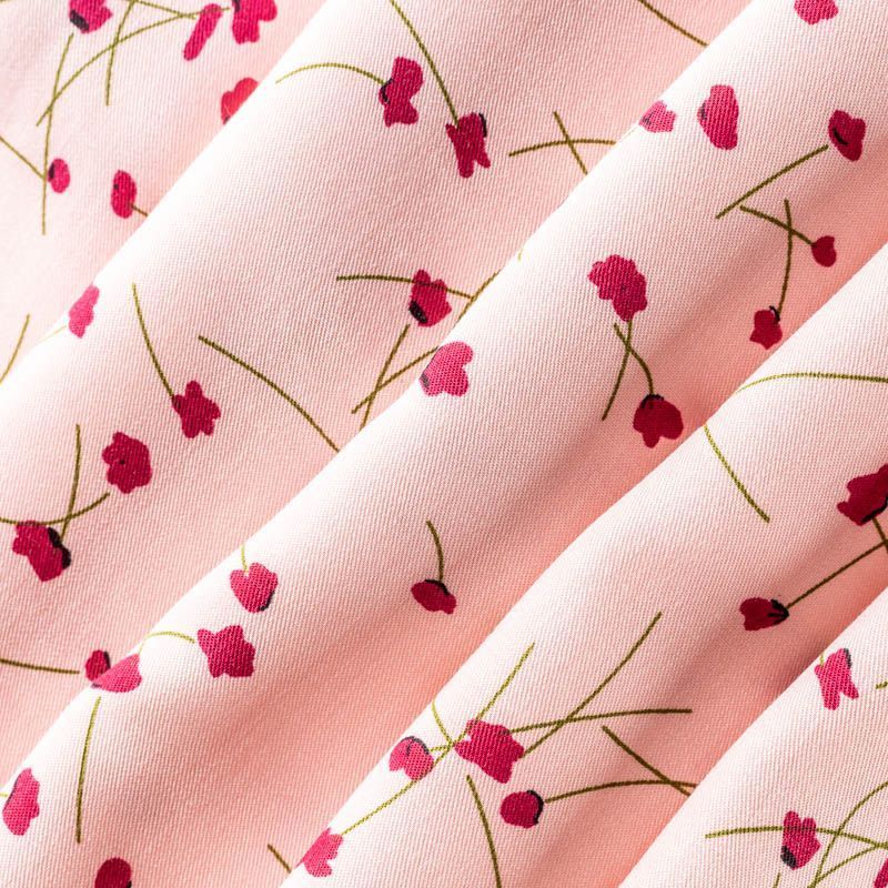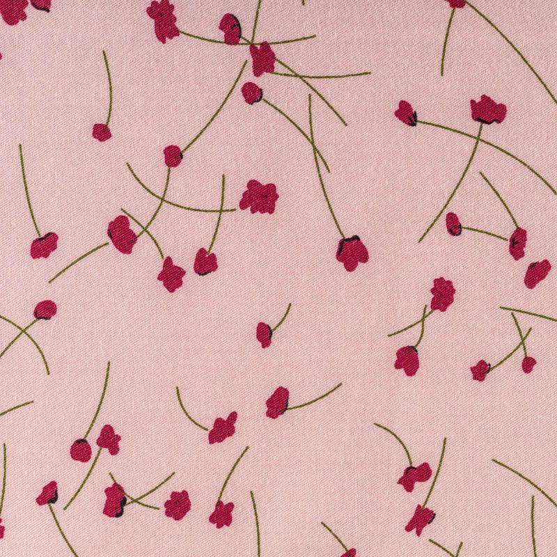 Качественный вискозный твил-штапель с принтом из мелких стилизованных маков на нежном розовом фоне. Мягкая ткань средней плотности, имеет саржевое плетение и характерный диагональный рубчик на поверхности. Хорошо сохраняет форму, не сильно мнется и не деформируется в процессе эксплуатации. Красиво ложится в складки, поэтому прекрасно подойдет на длинные драпированные юбки и платья, туники, на свободные брюки или шорты, топы.