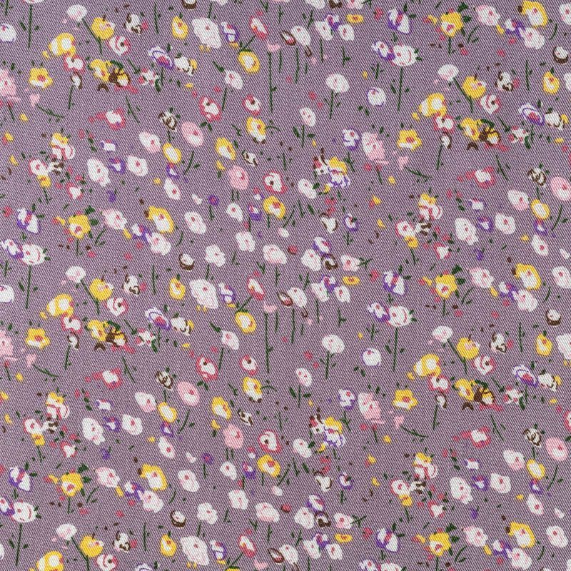 Качественный вискозный твил-штапель с нежным принтом из мелких цветочков на фоне сложного сиреневого оттенка. Мягкая ткань средней плотности, имеет саржевое плетение и характерный диагональный рубчик на поверхности. Хорошо сохраняет форму, не сильно мнется и не деформируется в процессе эксплуатации.  Красиво ложится в складки, поэтому прекрасно подойдет на длинные драпированные юбки и платья, туники, на свободные брюки или шорты, топы.