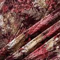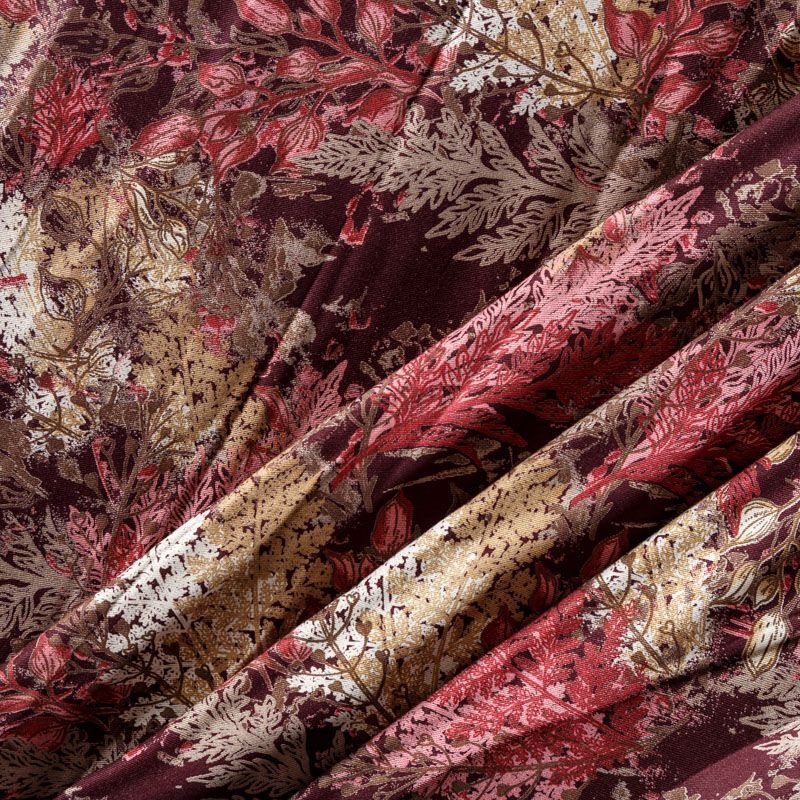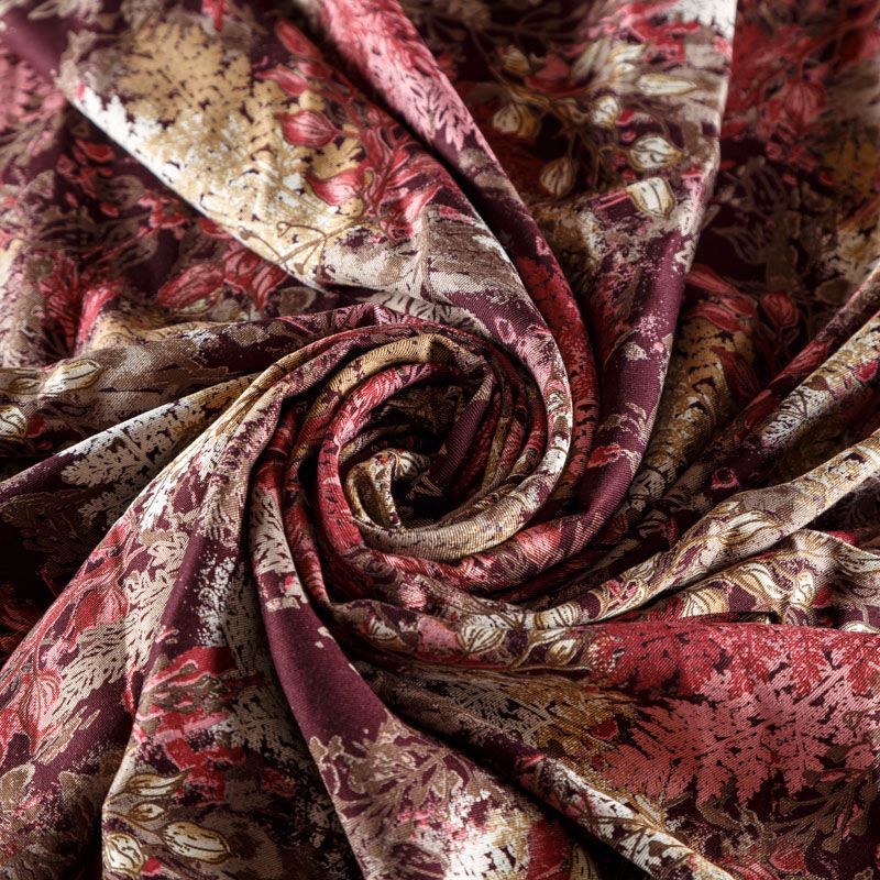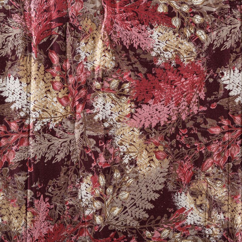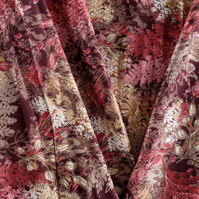 Плотная и мягкая ткань оттенка марсала с растительным принтом, имеет саржевое плетение и характерный диагональный рубчик на поверхности. Отлично сохраняет форму, не сильно мнется и не деформируется в процессе эксплуатации. Красиво ложится в складки, поэтому прекрасно подойдет на длинные драпированные юбки и платья, на свободные брюки или шорты, топы.