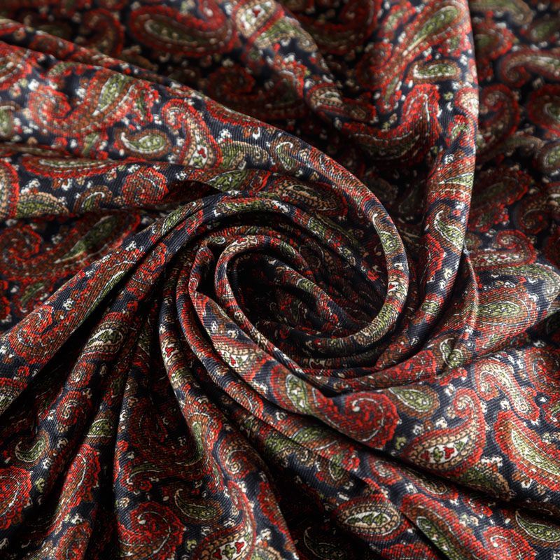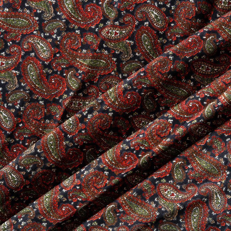 Плотная и мягкая ткань черного цвета с узором пейсли в красно-зеленых оттенках, имеет саржевое плетение и характерный диагональный рубчик на поверхности. Отлично сохраняет форму, не сильно мнется и не деформируется в процессе эксплуатации.  Красиво ложится в складки, поэтому прекрасно подойдет на длинные драпированные юбки и платья, на свободные брюки или шорты, топы.