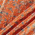 Плотная и мягкая ткань приглушенного оранжевого оттенка с ярким мелкоцветом, имеет саржевое плетение и характерный диагональный рубчик на поверхности. Отлично сохраняет форму, не сильно мнется и не деформируется в процессе эксплуатации. Красиво ложится в складки, поэтому прекрасно подойдет на длинные драпированные юбки и платья, на свободные брюки или шорты, топы.