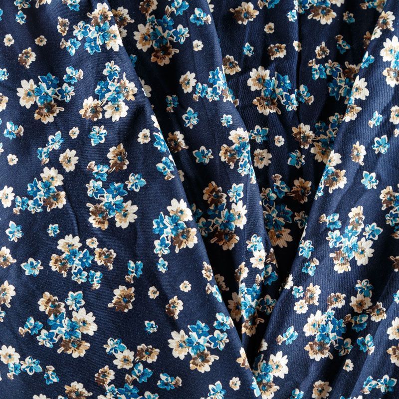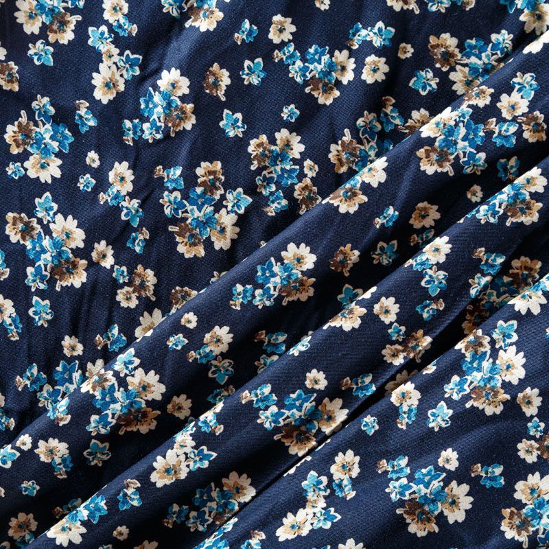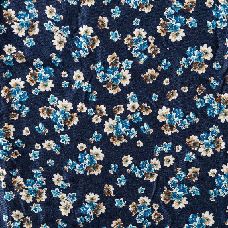 Плотная и мягкая ткань тесно-синего оттенка с ярким мелкоцветом, имеет саржевое плетение и характерный диагональный рубчик на поверхности. Отлично сохраняет форму, не сильно мнется и не деформируется в процессе эксплуатации. Красиво ложится в складки, поэтому прекрасно подойдет на длинные драпированные юбки и платья, на свободные брюки или шорты, топы.