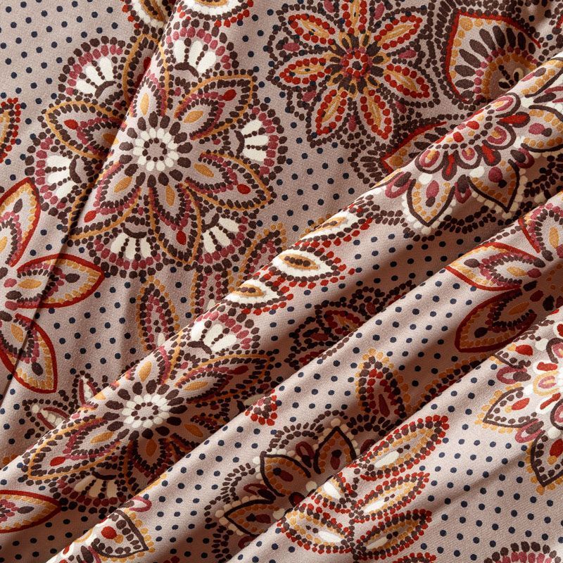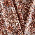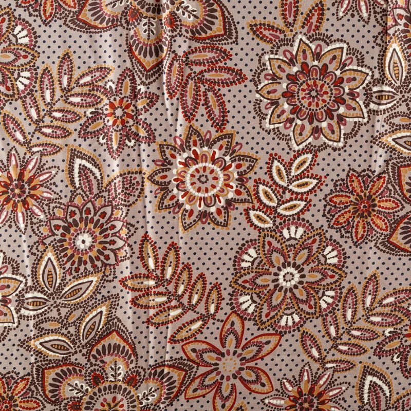 Плотная и мягкая ткань бежевого оттенка со стилизованным цветочным орнаментом, имеет саржевое плетение и характерный диагональный рубчик на поверхности. Отлично сохраняет форму, не сильно мнется и не деформируется в процессе эксплуатации.  Красиво ложится в складки, поэтому прекрасно подойдет на длинные драпированные юбки и платья, на свободные брюки или шорты, топы.