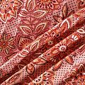Плотная и мягкая ткань припыленного розового оттенка со стилизованным цветочным орнаментом, имеет саржевое плетение и характерный диагональный рубчик на поверхности. Отлично сохраняет форму, не сильно мнется и не деформируется в процессе эксплуатации. Красиво ложится в складки, поэтому прекрасно подойдет на длинные драпированные юбки и платья, на свободные брюки или шорты, топы.