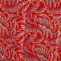 Плотная и мягкая ткань темно-красного оттенка с фантазийным принтом, имеет саржевое плетение и характерный диагональный рубчик на поверхности. Отлично сохраняет форму, не сильно мнется и не деформируется в процессе эксплуатации. Красиво ложится в складки, поэтому прекрасно подойдет на длинные драпированные юбки и платья, на свободные брюки или шорты, топы.