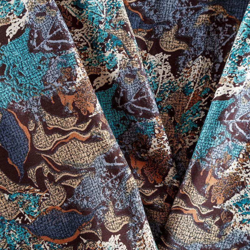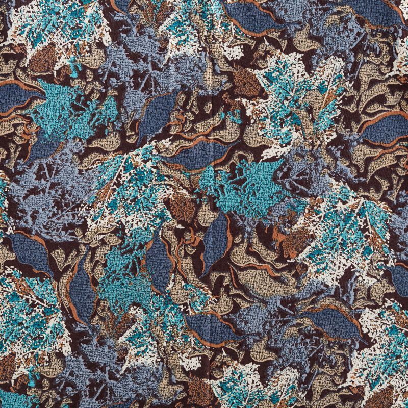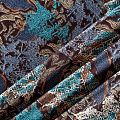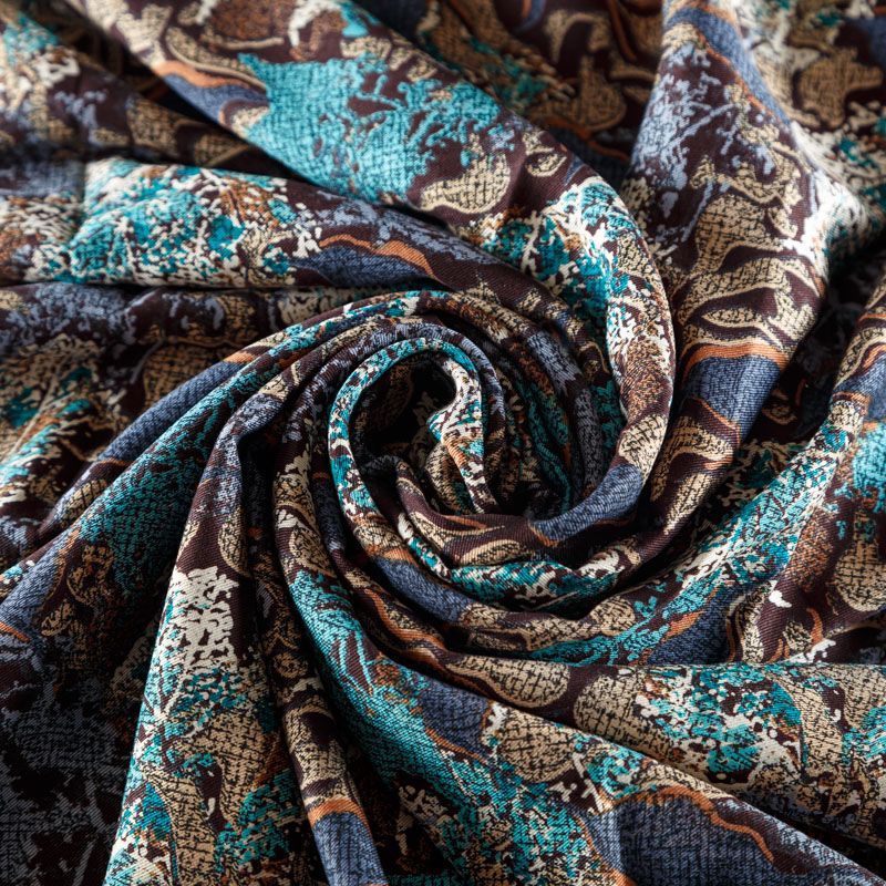 Плотная и мягкая ткань черного цвета со стилизованным растительным принтом в сине-бирюзовых оттенках, имеет саржевое плетение и характерный диагональный рубчик на поверхности. Отлично сохраняет форму, не сильно мнется и не деформируется в процессе эксплуатации. Красиво ложится в складки, поэтому прекрасно подойдет на длинные драпированные юбки и платья, на свободные брюки или шорты, топы, комбинезоны, а также для домашней одежды.