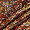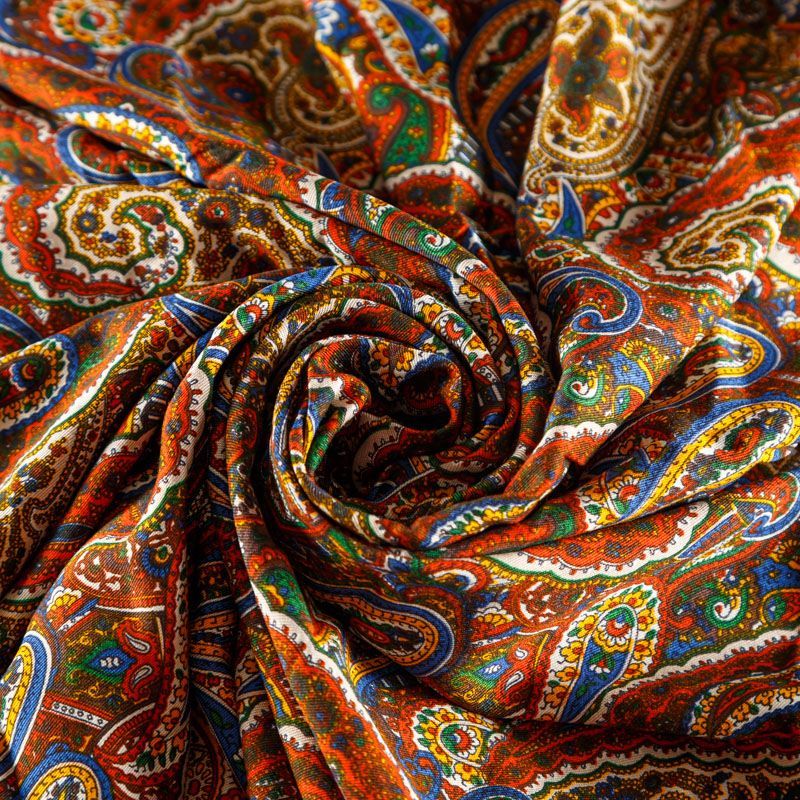 Плотная и мягкая ткань бежевого оттенка с богатым узором пейсли в желто-коричневых тонах, имеет саржевое плетение и характерный диагональный рубчик на поверхности. Отлично сохраняет форму, не сильно мнется и не деформируется в процессе эксплуатации. Красиво ложится в складки, поэтому прекрасно подойдет на длинные драпированные юбки и платья, на свободные брюки или шорты, топы, комбинезоны, а также для домашней одежды.