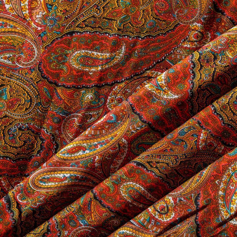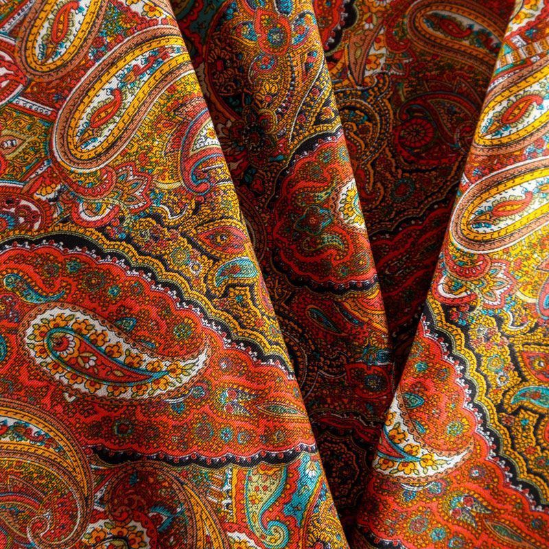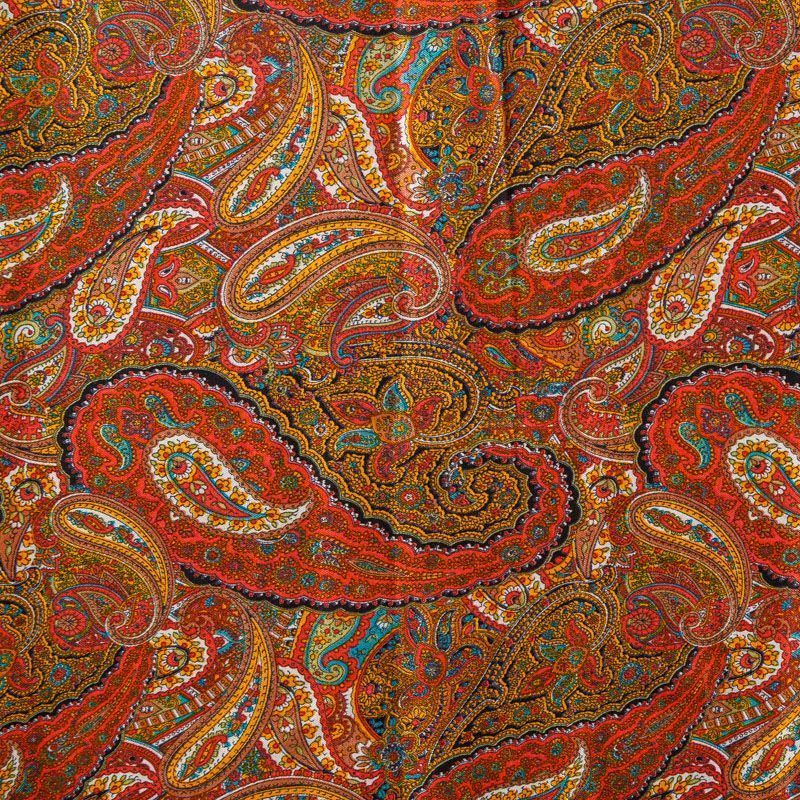 Плотная и мягкая ткань оранжевого оттенка с богатым узором пейсли, имеет саржевое плетение и характерный диагональный рубчик на поверхности. Отлично сохраняет форму, не сильно мнется и не деформируется в процессе эксплуатации. Красиво ложится в складки, поэтому прекрасно подойдет на длинные драпированные юбки и платья, на свободные брюки или шорты, топы, комбинезоны, а также для домашней одежды.