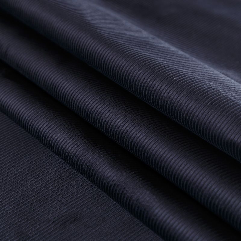 Итальянский костюмно-плательный вельвет из хлопка в черном оттенке. Очень приятный тактильно, поверхность бархатистая, рубчик средней ширины, не тянется, не просвечивает. Подойдет для пошива костюма, платья, юбки, брюк, верхней одежды.