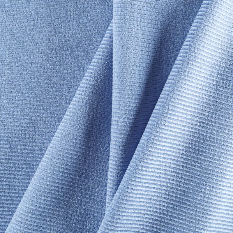 Итальянский хлопковый вельвет костюмно-плательной плотности голубого оттенка. Ткань имеет матовую фактурную поверхность в рубчик средней ширины, ворс короткий, мягкий и приятный на ощупь. Тянется за счет эластана в составе, хорошо драпируется и держит форму. Прекрасный вариант для пошива костюма, юбки, широких брюк, шорт, комбинезона, жакета, куртки или тренча.