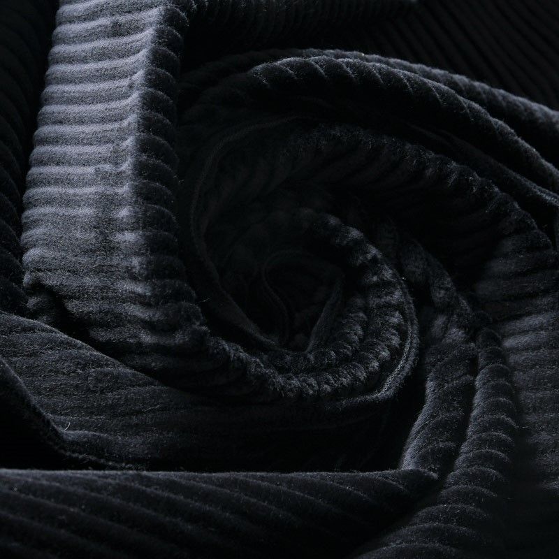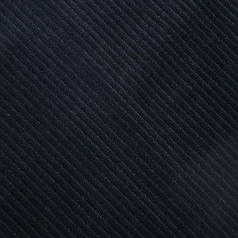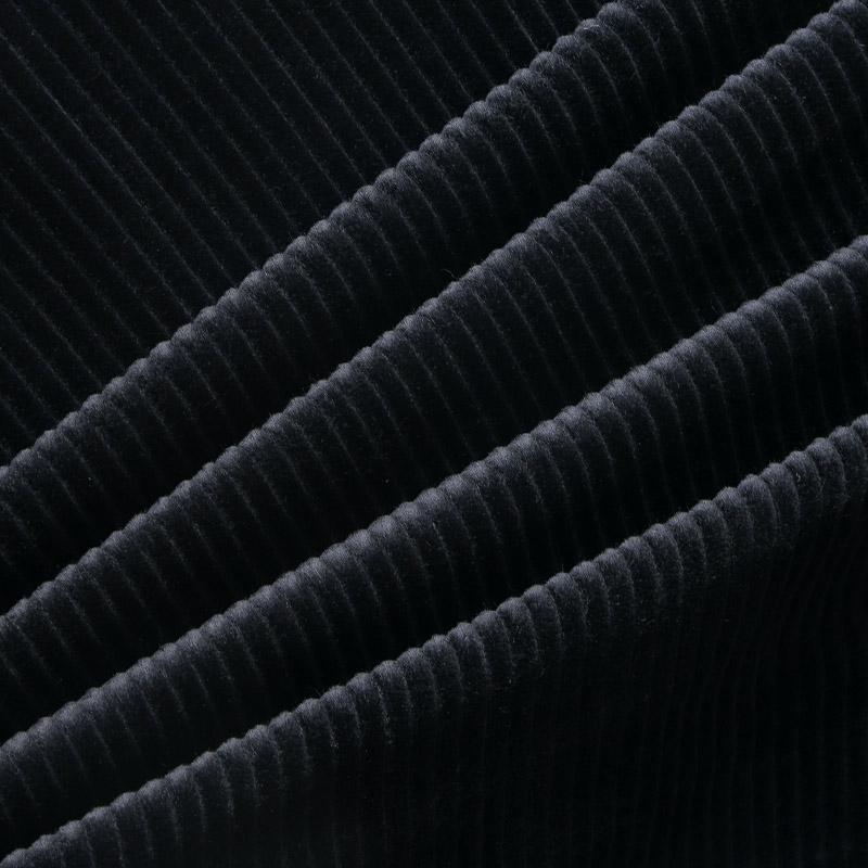 Итальянский хлопковый вельвет костюмно-плательной плотности глубокого черного цвета. Ткань имеет матовую фактурную поверхность в мягкий широкий рубчик, ворс короткий и приятный на ощупь. Хорошо драпируется и держит форму. Прекрасный вариант для пошива костюма, юбки, широких брюк, шорт, комбинезона, жакета, куртки или тренча.