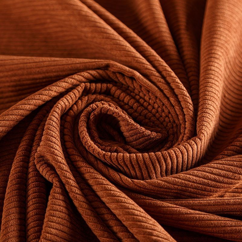Плательно-костюмный вельвет средней плотности, но удивительно мягкий с матовым блеском и бархатистой поверхностью. За счет вытравки ворса лицевая сторона фактурная, в рубчик средней толщины. Ткань очень пластичная, хорошо и мягко драпируется, не мнется. Прекрасно подходит для пошива костюмов, жакетов, платьев, юбок, брюк, шорт, а также  для изготовления даже детской одежды.
