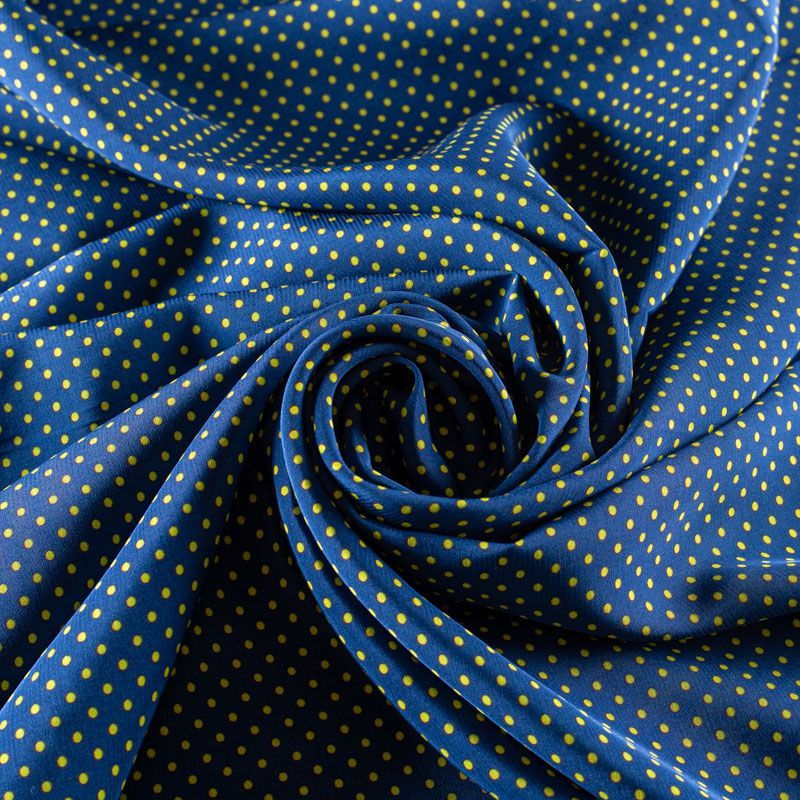 Плательно-рубашечная итальянская вискоза синего оттенка с принтом в мелкий горошек. Натуральная, дышащая ткань, очень приятная к телу, отлично драпируется, струится, не просвечивает. Хорошо подойдет для пошива платьев, рубашек, платьев-рубашек, блуз, юбок, брюк, летних костюмов, пыльников, детской одежды.