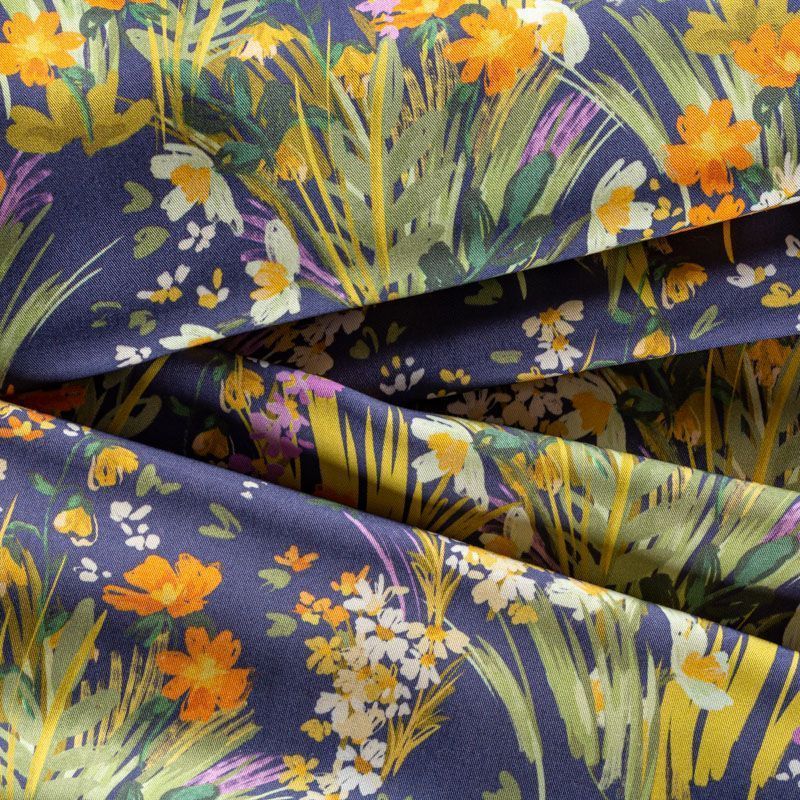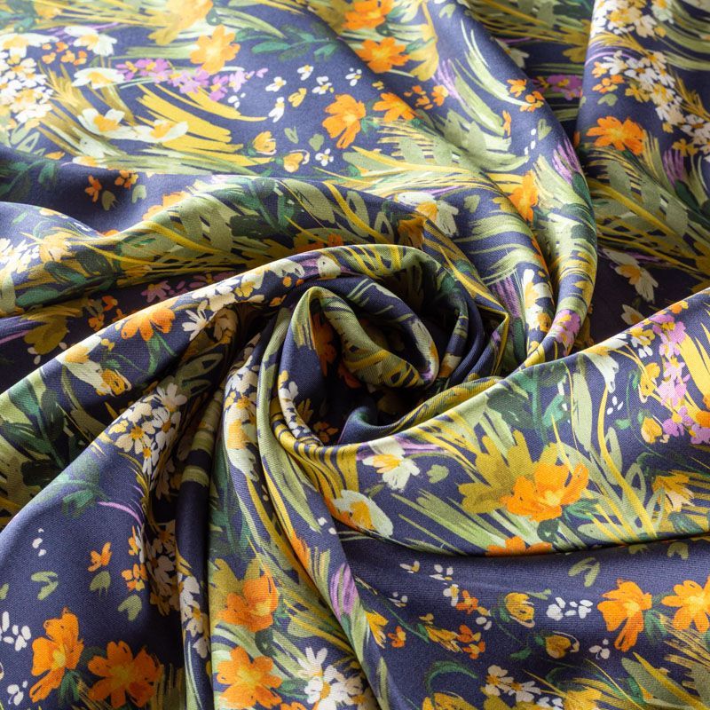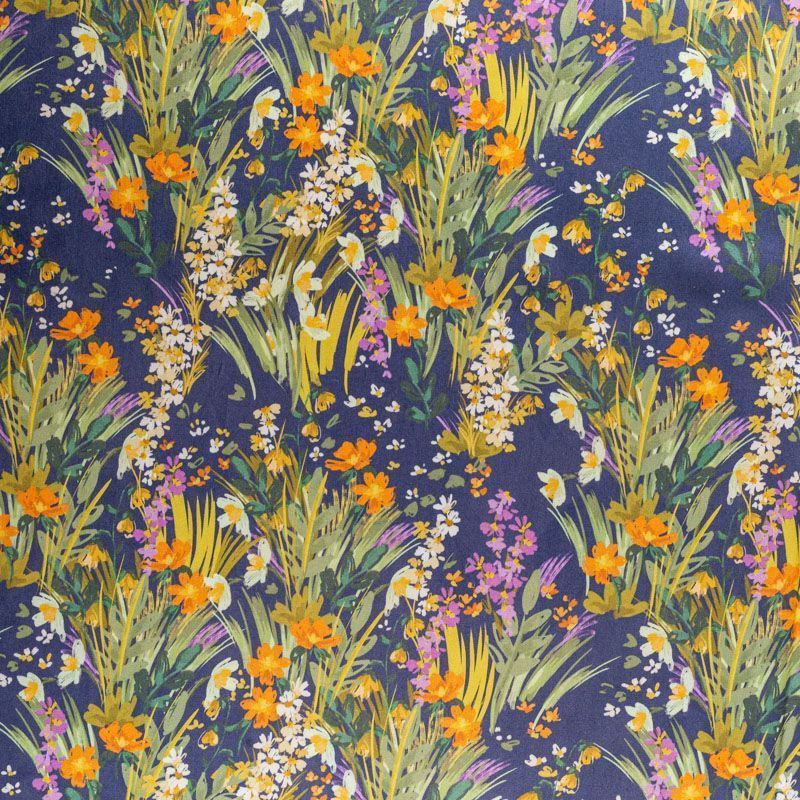 Плательно-рубашечная итальянская вискоза темно-синего оттенка с летним цветочным принтом . Натуральная, дышащая ткань, очень приятная к телу, отлично драпируется, струится, не просвечивает. Хорошо подойдет для пошива платьев, рубашек, платьев-рубашек, блуз, юбок, брюк, летних костюмов, пыльников, детской одежды.