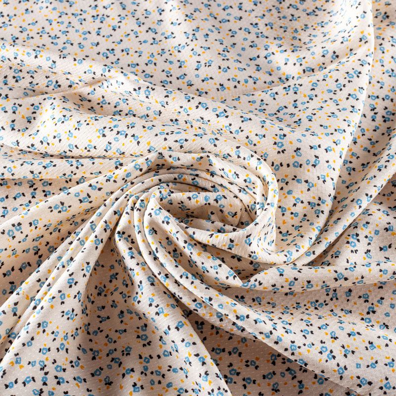 Итальянская жаккардовая вискоза сливочного оттенка с милыми стилизованными цветочками голубого цвета. Ткань тонкая, слегка просвечивает, отлично драпируется и струится, приятная на ощупь. Прекрасно подойдет для пошива платья, сарафана, топа, блузки, рубашки, юбки, пижамного костюма.