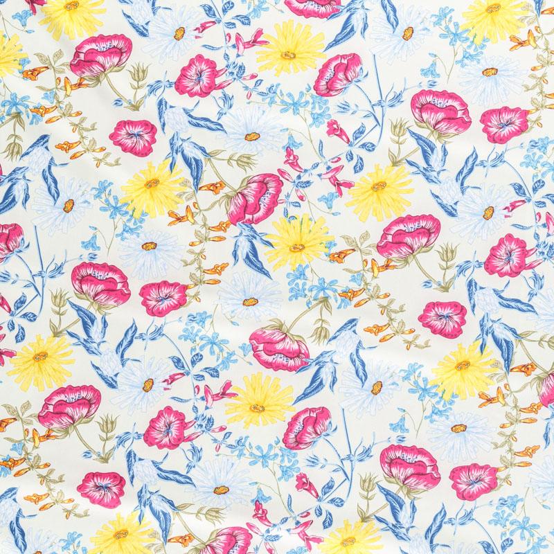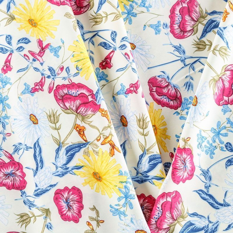 Легкая набивная ткань имеет высокую прочность, большую износоустойчивость. Материал упругий, мягкий, тянется за счет эластана в составе, хорошо драпируется, образует струящиеся складки. Идеально подойдет для пошива блуз, юбок, платьев, сарафанов.