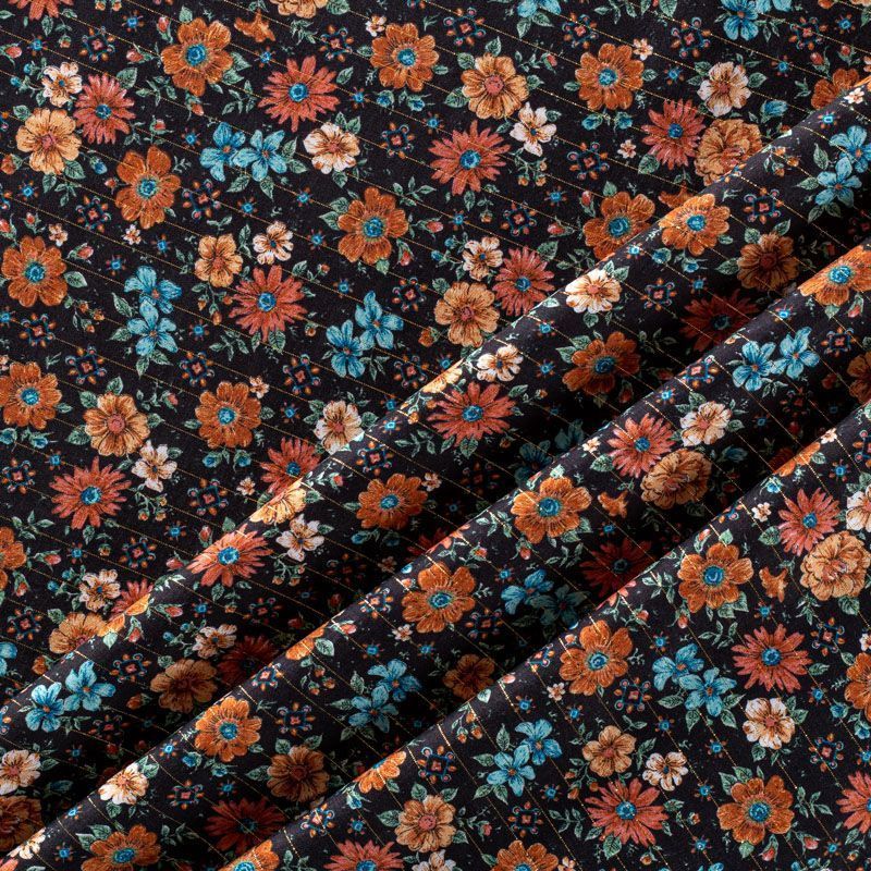 Итальянская плательно-блузочная вискоза с ярким цветочным принтом на черном фоне декорирована тонкой люрексовой полоской. Ткань очень пластичная, отлично драпируется и струится, мягкая и приятная на ощупь, не просвечивает. Прекрасно подойдет для пошива платья, топа, блузки, юбки.