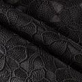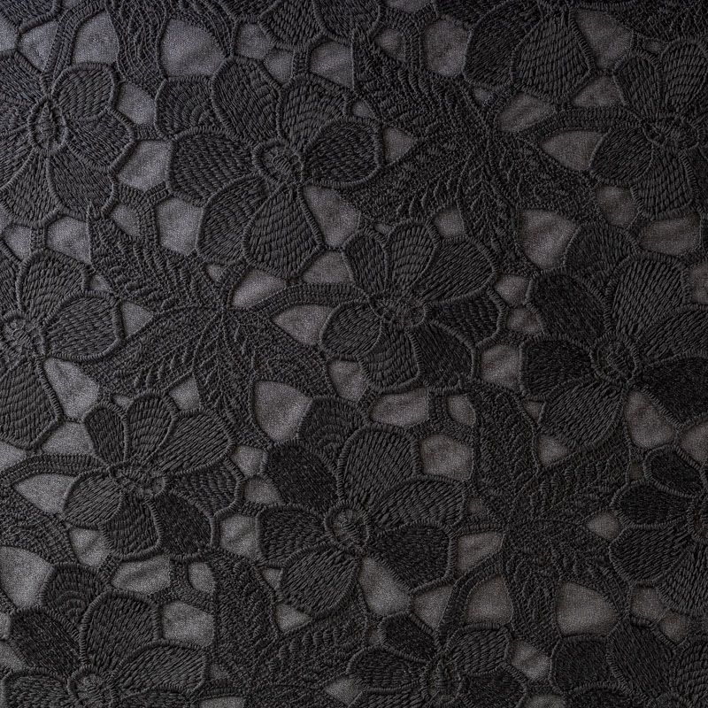 Очень эффектная вышивка на сетчатной основе черного цвета с мелкой ячейкой, мягкая и пластичная. Вышивка с цветочными мотивами в тон основе, плотная, расположена по всем полотну. Ткань приятная к телу, не колется, не цепляется. Идеальна для эффектных вечерних нарядов и для повседневного  образа в виде платья-футляра, топа, блузки, летнего жакета, кардигана, брюк или шорт. Требуется подклад.
