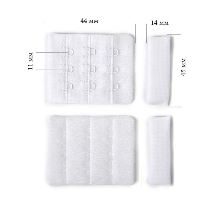 Текстильная застежка с 3 крючками и 3 рядами петель, ширина по линии втачивания 44 мм.