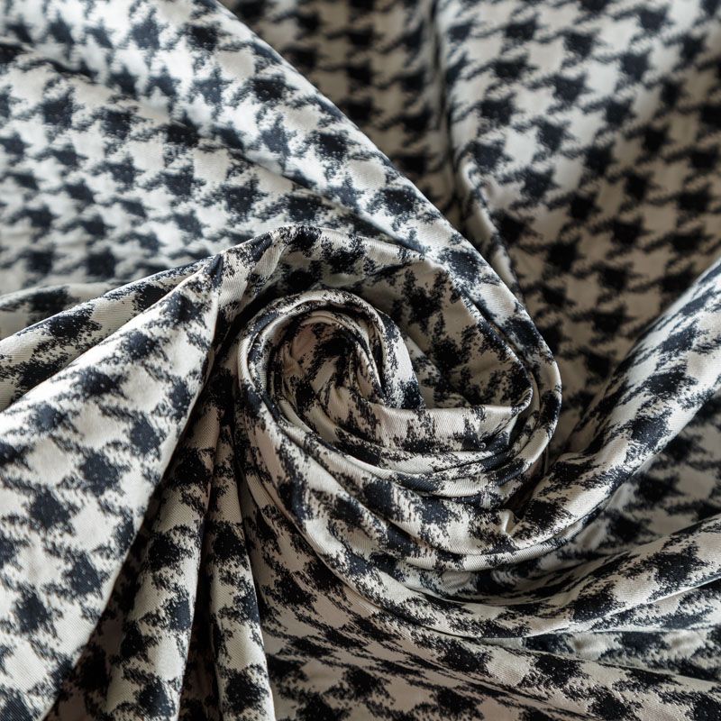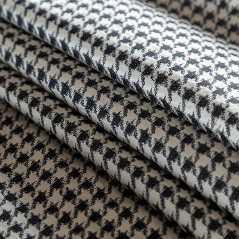 Итальянский костюмно-плательный жаккард в молочном оттенке с классическим дизайном гусиная лапка. Ткань плотная, поверхность матовая, слегка фактурная за счет плетения, хорошо драпируется и держит форму, тянется за счет эластана в составе, не просвечивает. Подойдет для пошива брючного костюма, платьев, жакетов, легких пальто, бомберов, юбок или шорт.
