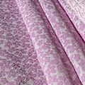 Молочный рельефный фон итальянского жаккарда  дополнен узором из объемных разновеликих цветов простой формы нежного розового оттенка. Ткань легкая, средней плотности, не просвечивает, не тянется. Хорошо держит форму и драпируется. Идеально подойдет для платьев различных силуэтов, костюмов, жакетов, юбок, шорт, легких пальто.
