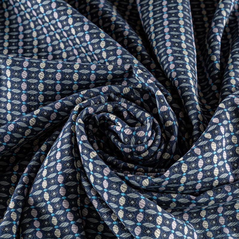Мягкий хлопковый жаккард в серо-синей цветовой гамме с мелким абстрактным узором. Ткань пластичная, непрозрачная, приятная на ощупь, тянется за счет эластана в составе, форму не держит, но хорошо драпируется красивыми складками. Будет комфортна для пошива костюма, женственного платья, юбки или брюк.