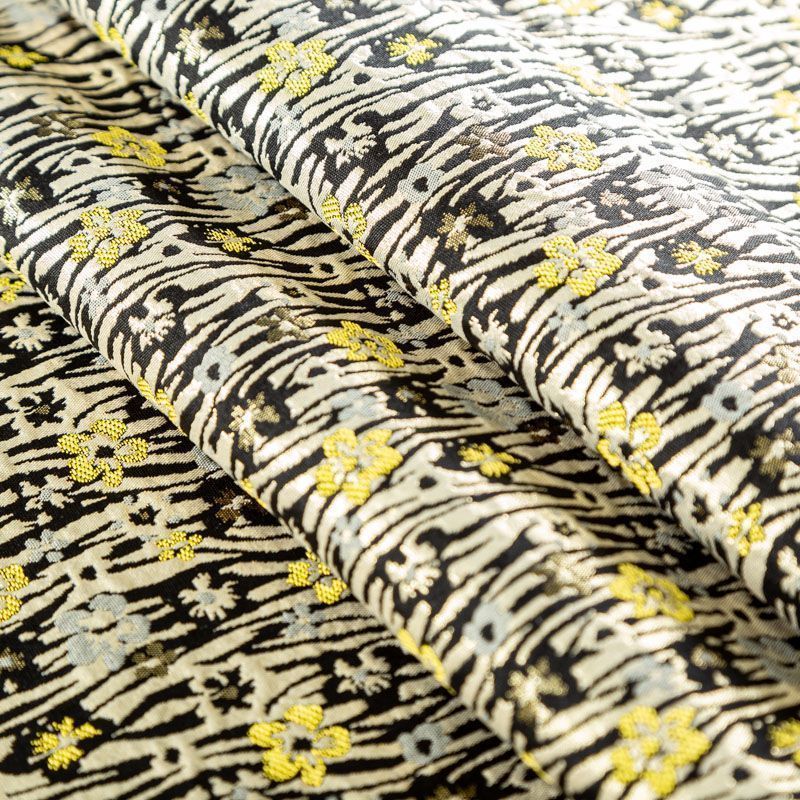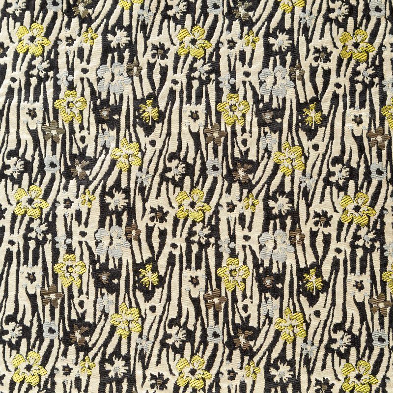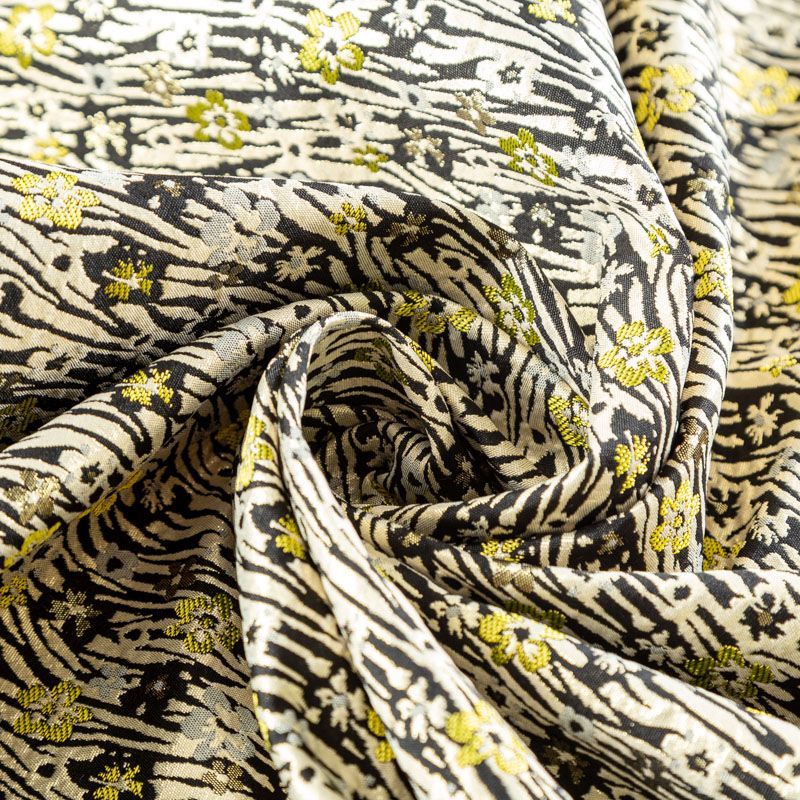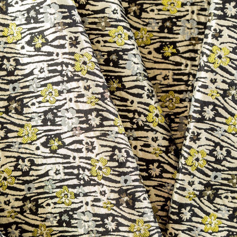 Итальянский жаккард песочно-черного цвета с добавлением люрексовой серебристой нити с мелким цветочным дизайном. Ткань легкая, но плотная, поверхность матовая, фактурная, хорошо драпируется и держит форму, не тянется и не просвечивает. Подойдет для пошива нарядных вечерних костюмов, платьев-футляров в стиле Dior, жакетов, топов, летних пальто, бомберов, юбок или шорт.
